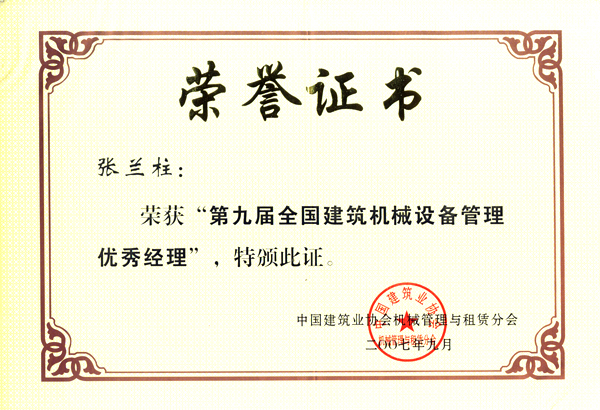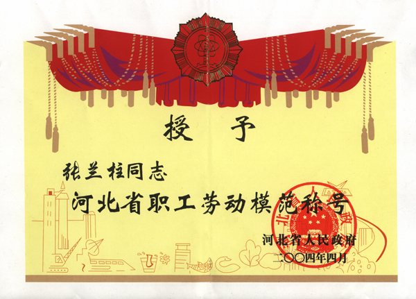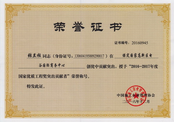 張?zhí)m柱同志以他杰出的工作業(yè)績被各級領(lǐng)導(dǎo)機(jī)關(guān)授予:全國、河北省、保定市建筑業(yè)優(yōu)秀企業(yè)經(jīng)理;優(yōu)秀企業(yè)家;優(yōu)秀共產(chǎn)黨員;優(yōu)秀黨務(wù)工作者;優(yōu)秀思想政治工作者;安全生產(chǎn)、工程質(zhì)量管理先進(jìn)個(gè)人;河北省優(yōu)秀經(jīng)理管理者;河北省建設(shè)系統(tǒng)勞動模范;河北省勞動模范等榮譽(yù)稱號
