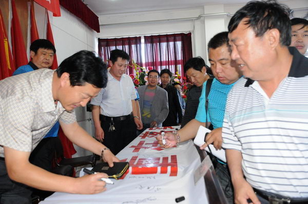 安監(jiān)站領(lǐng)導(dǎo)與董事長(zhǎng)在安全宣傳標(biāo)語(yǔ)上簽名 |